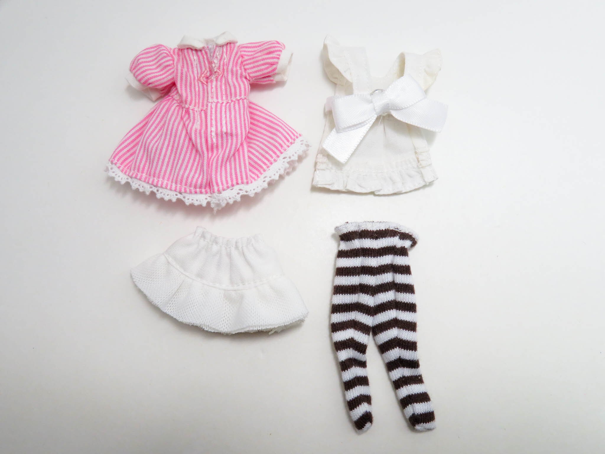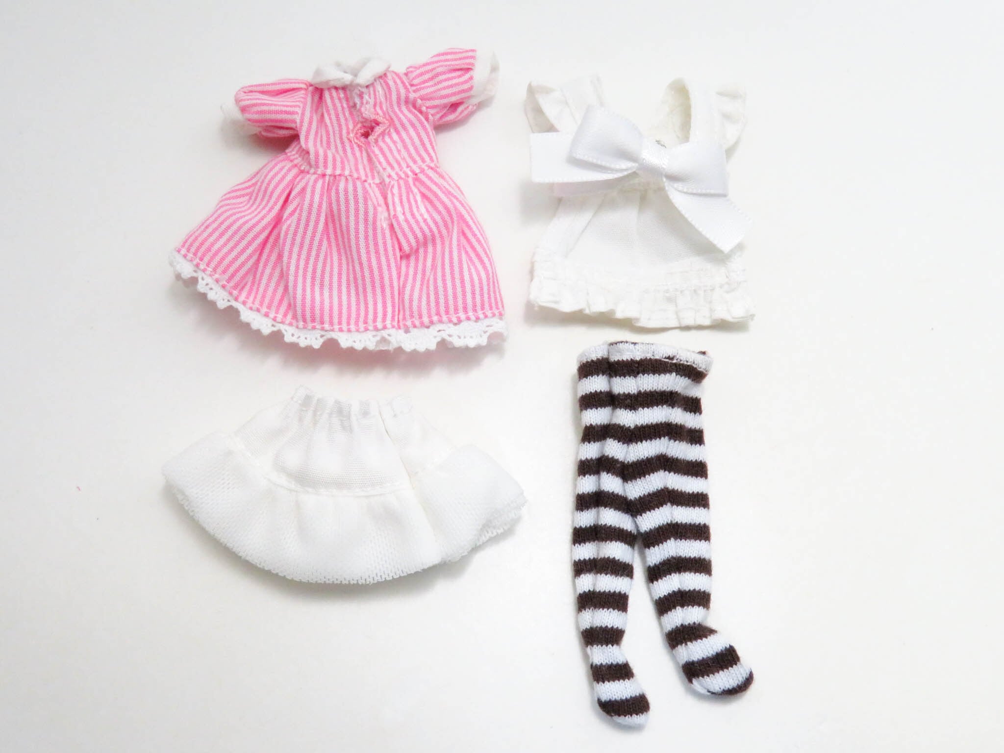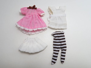 ・その他:布製品です。背面に台座用の穴あり。ストライプワンピースの背面はマジックテープになっております。エプロンの背面はスナップボタンで固定します。